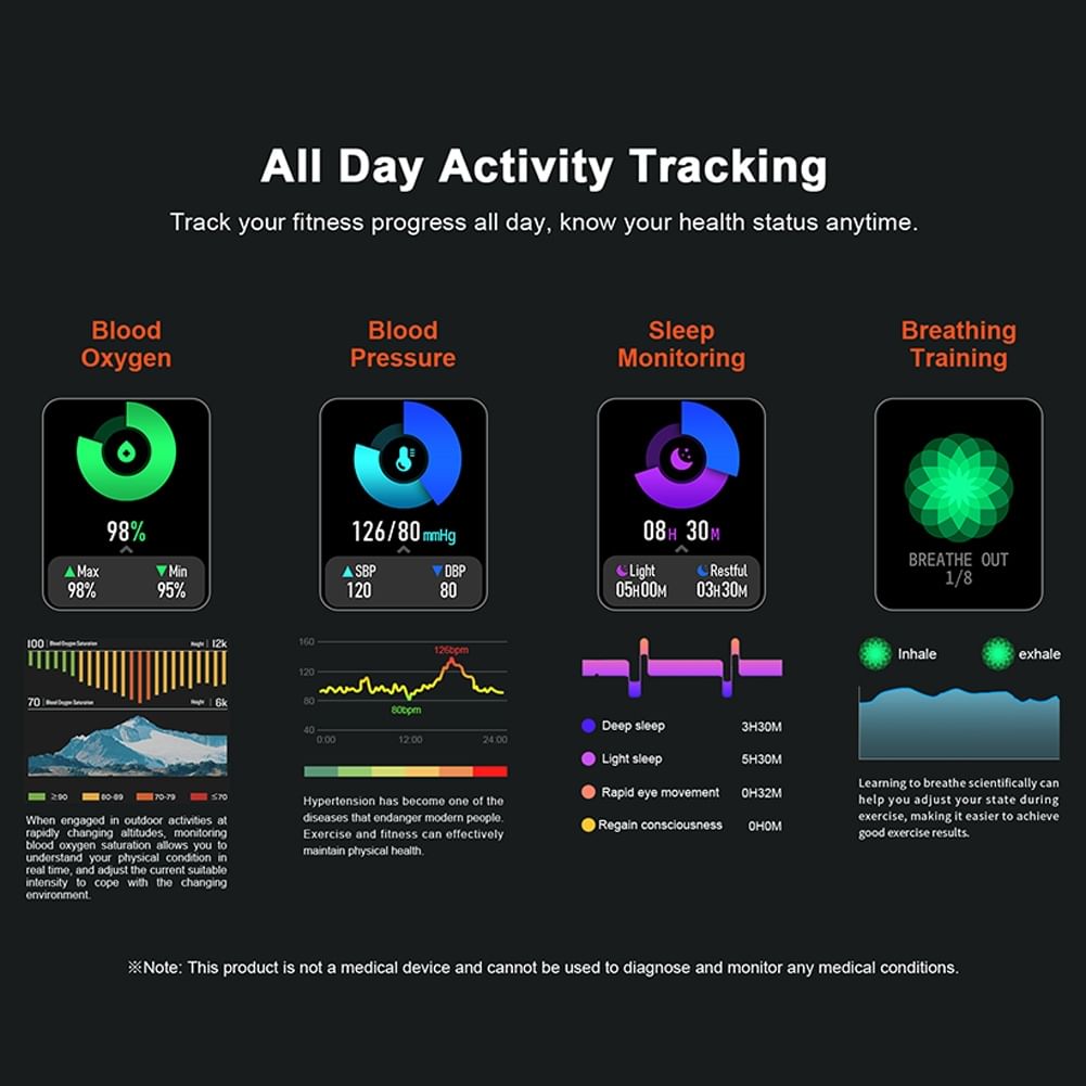 1. 20 Sports Modes and 3ATM Water Resistance: The sports tracker supports 20 sports modes such as running, walking, trail running, cycling, mountaineering, skiing, swimming, basketball, football, and baseball. During the running process, you can receive training data such as heart rate, pedometer, calories, speed, distance, activity time, etc. in real time, and you can also view your exercise route on the Da Fit App;