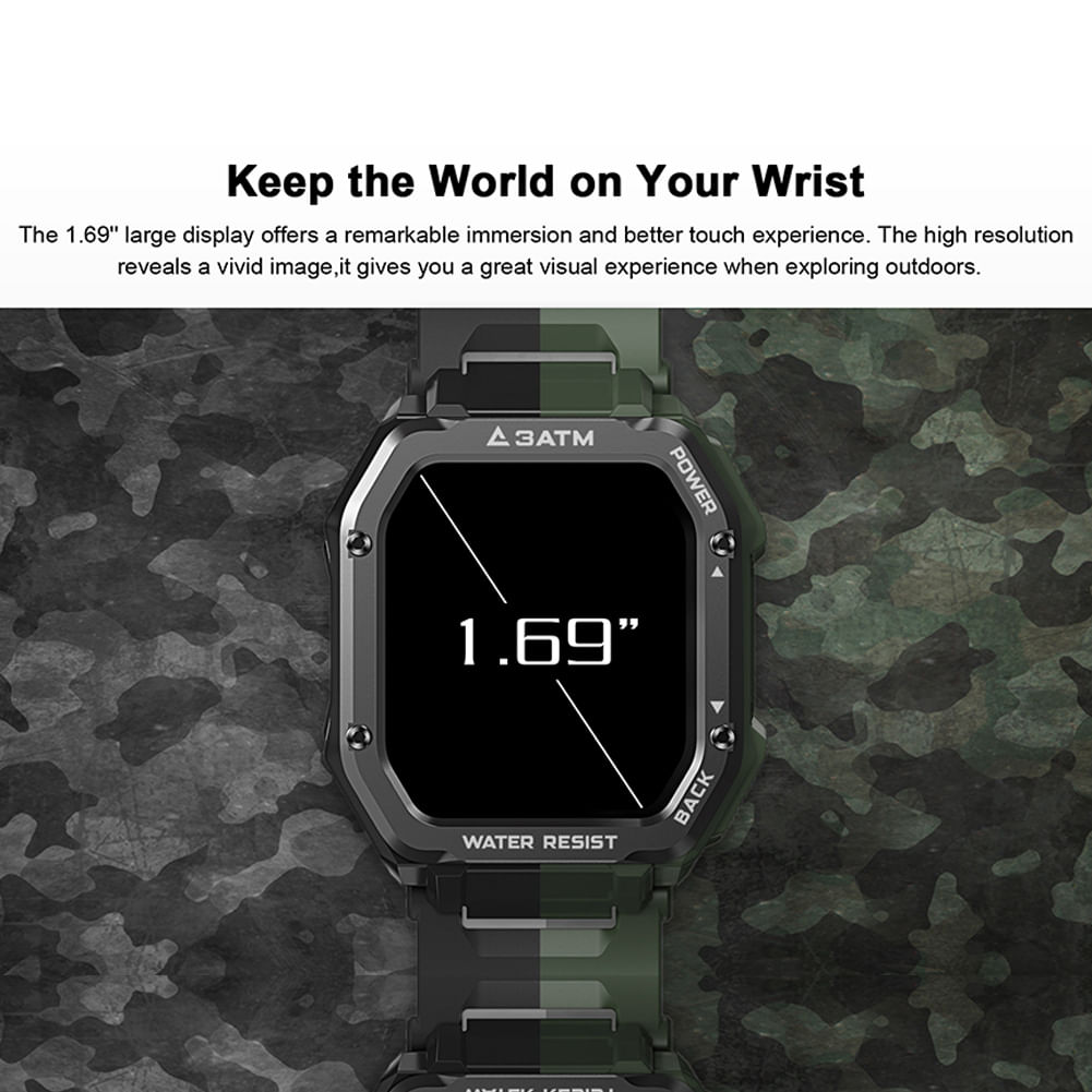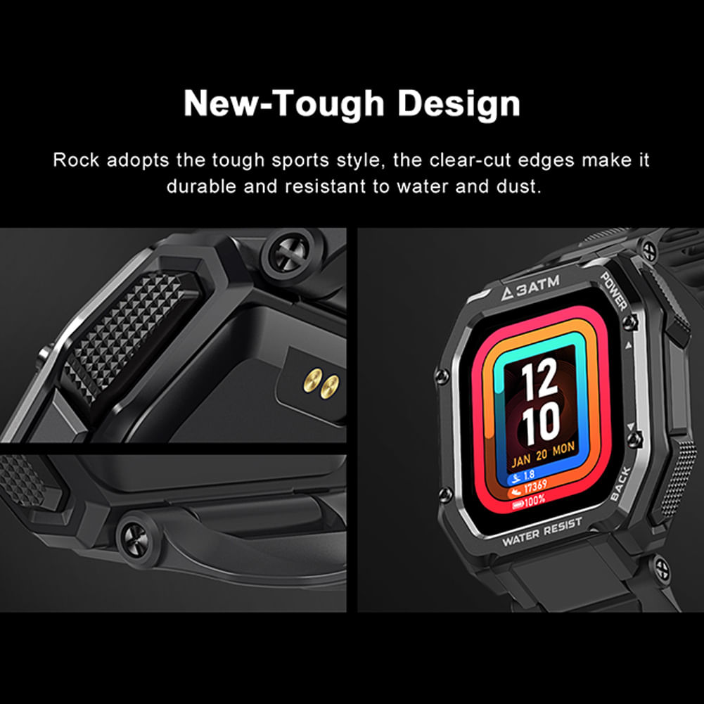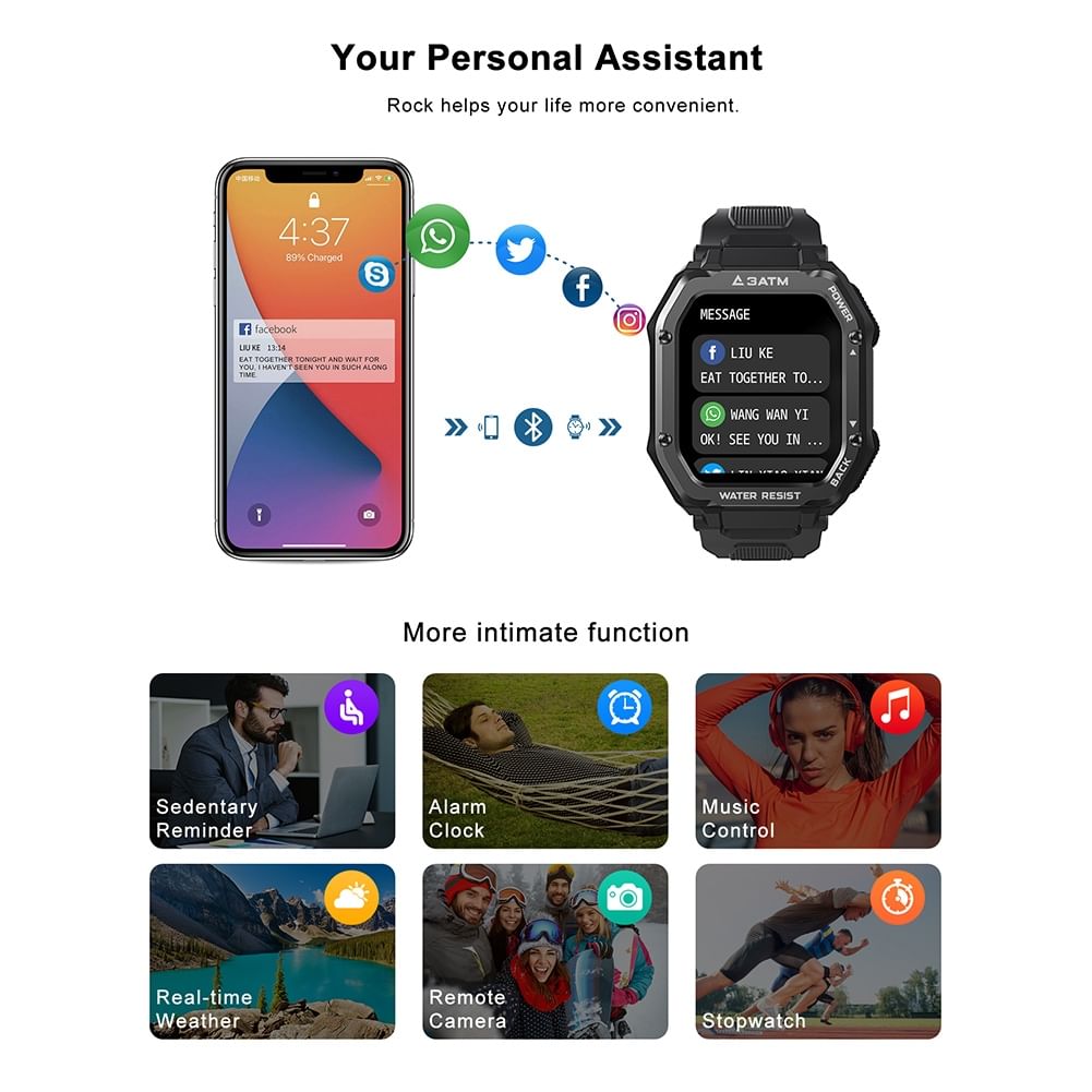 3. Multifunctional ROCK Smart Watch: Smart notifications for incoming calls and text messages (WeChat, QQ, Weibo, compatible for Facebook, compatible for Twitter, WhatsApp, Line, KakaoTalk, Instagram, Skype, etc.). Sleep monitoring, pedometer, sedentary reminder, alarm clock, weather, music/music control, 24 hours heart rate monitoring, blood pressure monitor, blood oxygen monitor. Bring more convenience to your life;