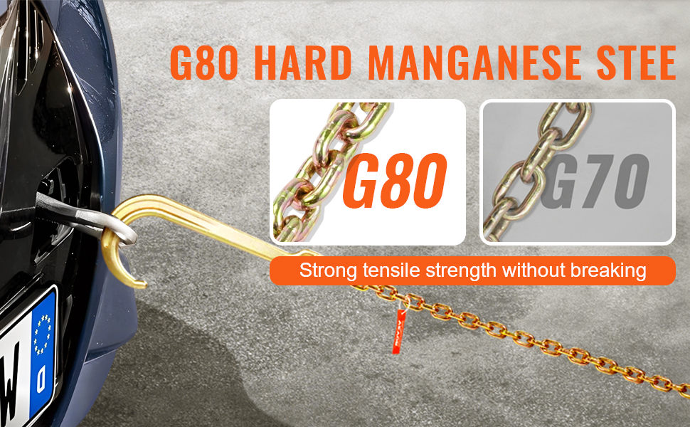 VEVOR, your exclusive tool expert. This Jhook chain is made of high-quality steel with Grade 80 overallstrength. It is also equipped with hooks to fit various types ofvehicles.