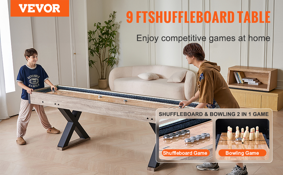 Maximize your enjoyment with our 2-in-1shuffleboard that combines two games in one. Play the classicshuffleboard game or switch to an engaging game of bowling.