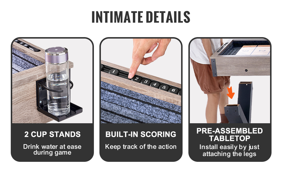 The table games for adults include 2 cupholders, so you can easily keep your drinks nearby. Built-inscoring helps you keep track of the game, allowing you to focus onplaying. The pre-assembled tabletop means you only need to attachthe legs, making the setup process straightforward and quick.