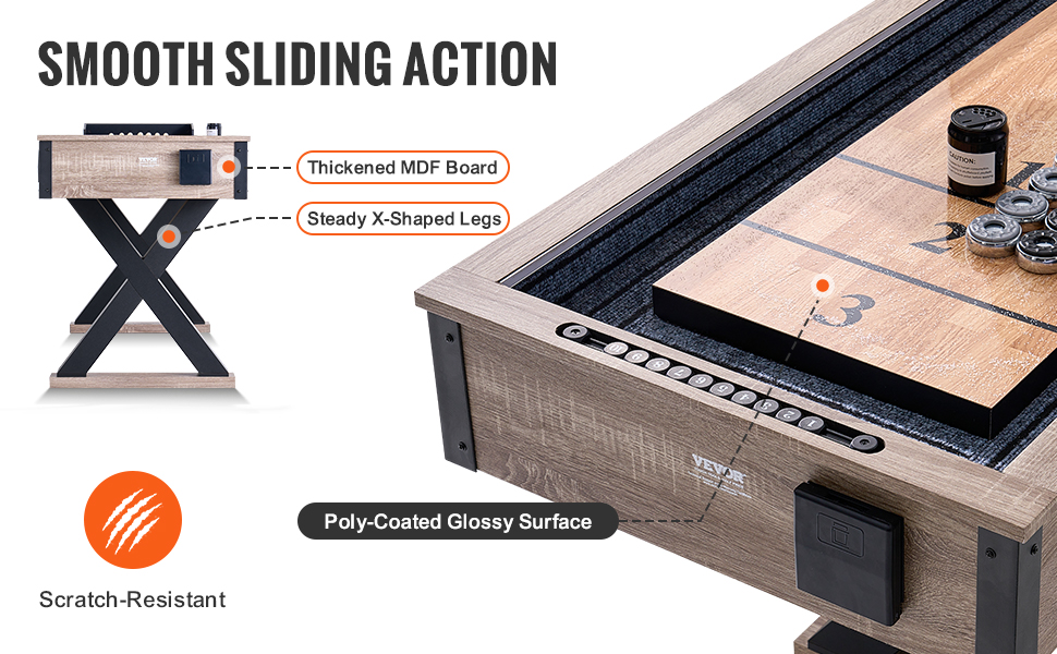 Constructed with thickened MDF board andX-shaped legs, the shuffle board offers increased stability andsecurity. This durable design provides a solid playing experience,allowing you to concentrate on your game without any stabilityconcerns.