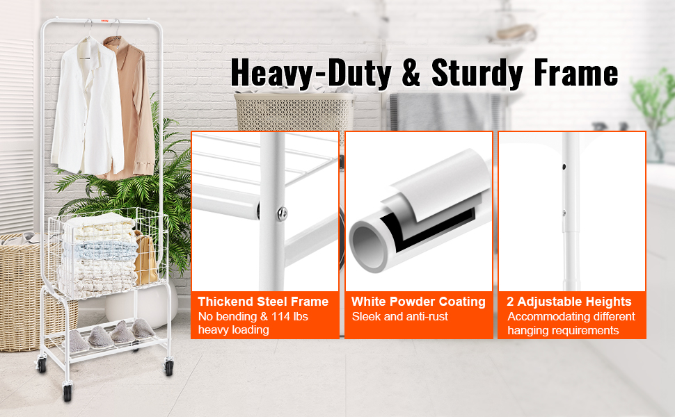 Bid farewell to deformation and wobblingas this rolling laundry butler ‘s reinforced steel frameeffortlessly supports up to 114 lbs. Its white powder-coatedsurface provides superior rustproofing for long-term usage.
