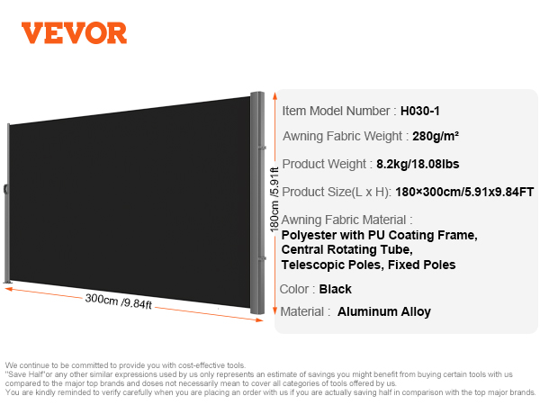 The side awning features high-density280g/m² polyester fabric with a robust PU coating, providingoutstanding waterproof performance and tensile strength. With aUV30+ protection level, it keeps you and your family away from UVrays. Enjoy the outdoors without worrying about the weather!