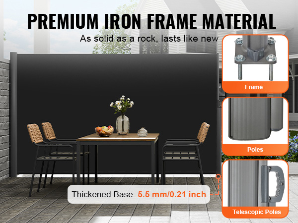 The structure of the retractable patioscreen is constructed from high-strength aluminum alloy,powder-coated for a stylish appearance and corrosion-proof feature.The metal expansion screws further enhance stability, ensuring itstands stably outsides.